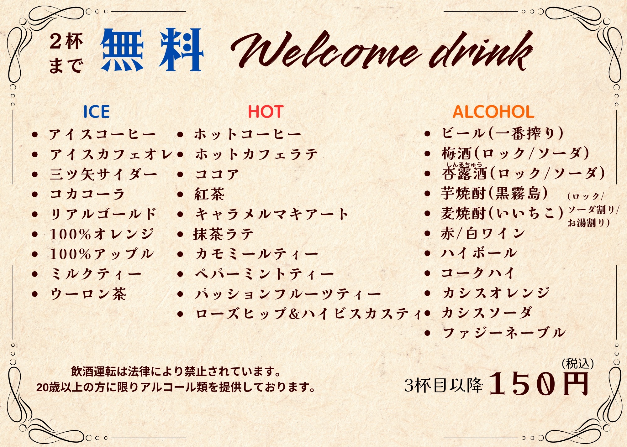 もっと飲みたい!という方のために、3杯目以降は1杯150円でご提供いたします。
