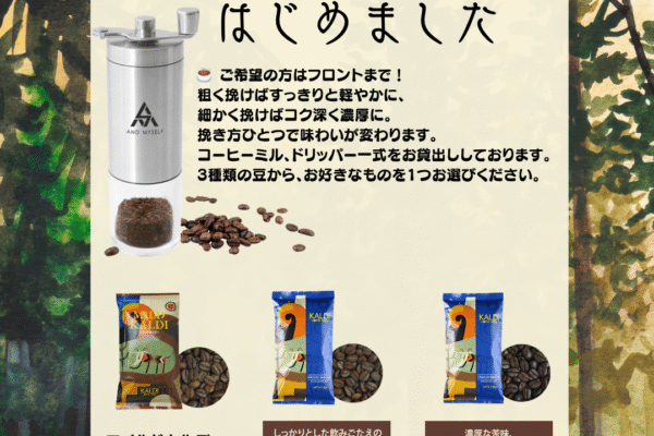 コーヒーミルとドリッパーなどの一式をフロントにて貸出しております。